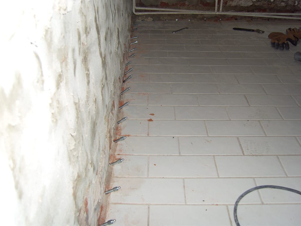Um das Wasser am Aufsteigen im Gebäude zu hindern, wird eine Bohrlochkette gelegt. Mit Druck wird speziell dafür geeignetes Harz ins Mauerwerk gepresst. Ziel ist es, die Bauporen zu verstopfen und eine Sperrschicht in das Mauerwerk zu bringen sodass sich das Wasser nicht mehr ausbreiten kann. Nun kann die Wand trocknen beziehungsweise trocken bleiben.