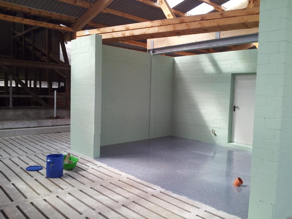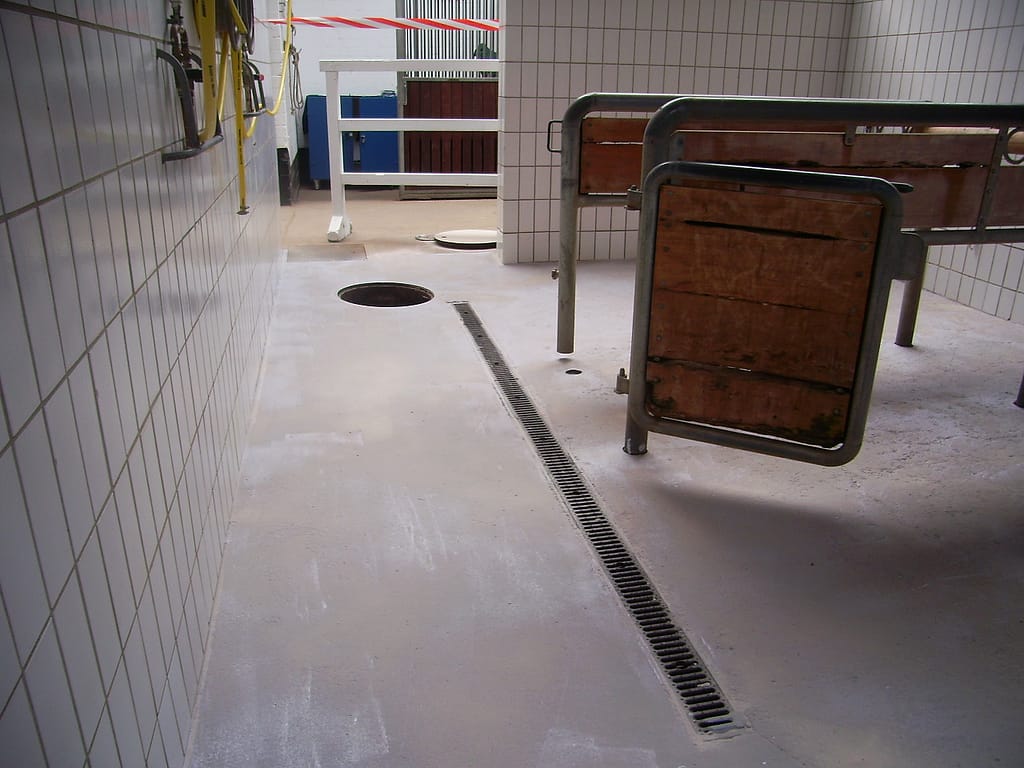Für die Schweinehaltung ist eine Kunststoffbeschichtung eine gute Alternative zu Fliesen, da keine mineralischen Fugen durch Tiere angegriffen werden können.